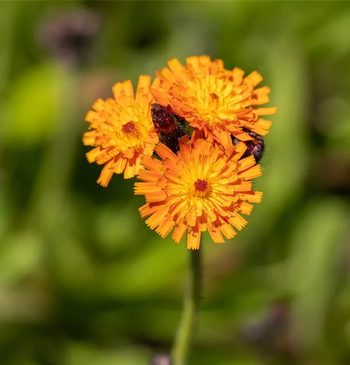 Bodendecker, der auch gerne mal im Garten vagabundiert: Lästig wird das hübsche Orangerote Habichtskraut aber nur selten. Es macht ober- und unterirdische Ausläufer, mit denen es sich zügig verbreitet. Um eine zusätzliche Selbstaussaat zu vermeiden, kann man die Blüten vor dem Ausreifen abzupfen. Am Naturstandort wächst das Orangerote Habichtskraut gerne auf frischem bis feuchtem Boden. Es kommt aber auch mit sehr trockenen Standorten zurecht und passt sich nahezu jeder Gartensituation an. Die orangeroten Blütenkörbchen sind klein und sitzen zu mehreren in einem Knäuel am Ende eines blattlosen Stängels. Am Grund der robusten Staude wachsen spatelförmige bis lanzettliche Blätter in einer feinbehaarten Rosette. Das Orangerote Habichtskraut bildet mit der Zeit dichte Polster und eignet sich gut als wüchsige Unterpflanzung von Viburnum opulus (Gewöhnlicher Schneeball) und Frangula alnus (Gewöhnlicher Faulbaum).