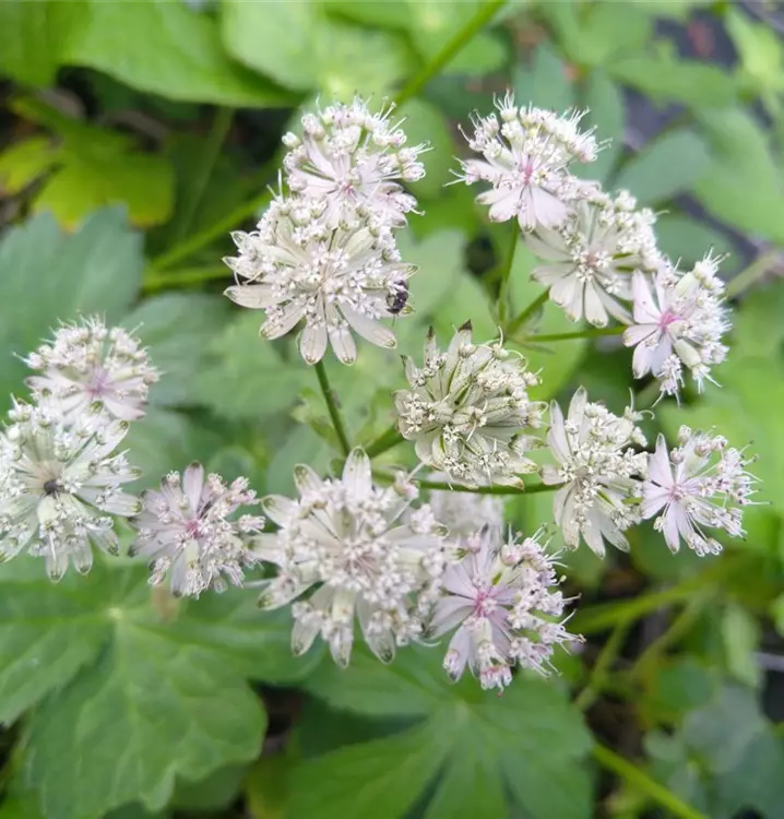 Sternstunden im Garten: In der Natur findet man die Große Sterndolde häufig auf Wiesen, Hochstaudenfluren und Wäldern in montanen Regionen Europas. Die sommerblühende Schönheit fällt vor allem durch ihre markanten, namensgebenden Blütenstände auf. Sie sitzen endständig auf langen, aufrechten Stängeln. Das obere Stängelende verzweigt sich und trägt die einfachen, kugeligen Dolden – meist eine große und mehrere kleine. Jede Dolde wird von charakteristischen Hüllblättern umgeben, die wie ein Stern am Grund der Dolde angeordnet sind. Sie sind recht derb und weiß. Die einzelnen Dolden bestehen aus ebenfalls weißen, kleinen Blütchen. Gegen Abend beugen sich die Stiele der Dolden leicht nach unten und schützen so den Pollen vor Feuchtigkeit. Die anmutige Große Sterndolde passt gut in naturnahe Pflanzungen, z.B. mit Aconitum napellus, Lunaria rediviva, Anemone rapunculoides, Gräsern und Farnen. Ihre Wurzeln und das Kraut wurden und werden übrigens in der Volksheilkunde bei Magenbeschwerden eingesetzt. Man sollte sie jedoch mit Bedacht einsetzt, da sie bei Überdosierung giftig wirkt. Gute Schnittblume.