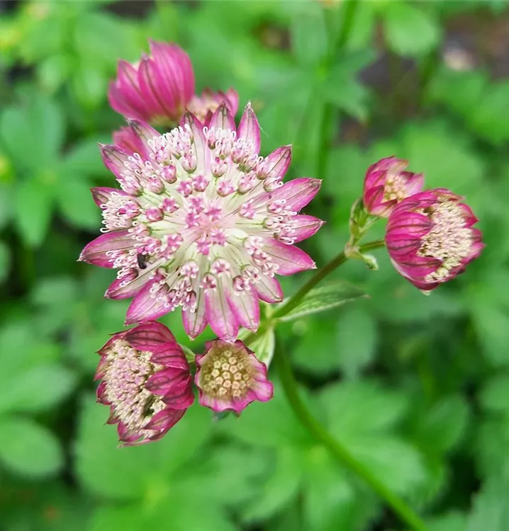 Beliebte Sorte für Bauerngärten und Rabatten: Die markanten Blütenstände der Großen Sterndolde standen Pate für ihren deutschen und botanischen Namen (griech. aster bzw. astron = Stern). Sie sitzen in einer kugeligen Dolde, die umgeben ist von sternförmig angeordneten Hochblättern. Die einfache, dichte Blütendolde besteht bei dieser Sorte aus winzigen, dunkelroten Blütchen. Auch die derben Hochblätter sind dunkelrot. Die dekorativen Blütenstände werden getragen von langen, aufrechten und fast blattlosen Stängeln. Ihnen zu Füßen wachsen grundständige, langgestielte Laubblätter. Sie sind handförmig gelappt und satt grün. Die anmutigen, buschigen Horste der Große Sterndolde eignen sich für unterschiedliche Pflanzaufgaben, wenn der Boden am Standort nur gleichmäßig feucht ist. Vor und unter lichten Gehölzen gedeiht sie ebenso gut wie im Staudenbeet. Besonders schön sind naturnah gestaltete Pflanzungen mit anderen Wildstauden, wie z.B. Geranium sylvaticum, Molinia arundinacea und Farnen. Fühlt sie sich an ihrem Standort wohl, samt sie sich zuverlässig selbst aus. Gute Schnittblume.