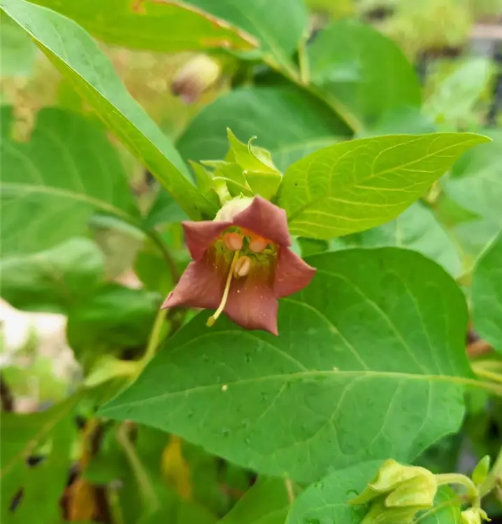 In den Blattachseln erscheinen glockige, kleine Blütenkelche. Sie sind außen braunviolett, mit leicht nach außen gebogenen Spitzen. Innen sind sie gelblichgrün und rot geadert. Bei der Echten Tollkirsche überscheiden sich Blüte und Reifezeit. An einer Pflanze findet man nebeneinander Blüten sowie unreife und reife Beeren. Sie liebt feuchte, schattige und doch warme Lagen in der Nähe von Laubgehölzen. Hier wächst sie gut zusammen mit Luzula sylvatica, Salvia glutinosa, Omphalodes verna und Lathyrus sylvestris. Wichtige Raupenfutter für seltene Schmetterlinge.