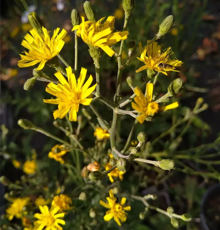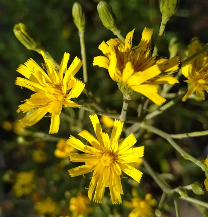 Stattliches Habichtskraut: Das Savoyer Habichtskraut hat einen aufrechten, horstigen Wuchs und unterscheidet sich damit von den meisten seiner bodendeckenden Verwandten. Die hellgelben Körbchenblüten bilden verzweigte, locker-rispige Blütenstände, die gerne von Bienen besucht werden. In der Natur besiedelt es vorzugsweise lichte Wälder. Im Garten passt das Savoyer Habichtskraut daher gut in die Gemeinschaft von Büschen und Hecken. Oder als Leitstaude in Rabatten und Beete, zusammen mit Pimpinella saxifraga (Kleine Bibernelle) und Prunella vulgaris (Gewöhnliche Braunelle). Schön ist die auffallende Pflanze auch in Blumenwiesen.