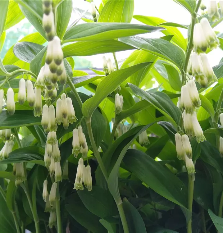 Für Beete mit Waldcharakter: Die Vielblütige Weißwurz ist eine klassische Waldstaude, die etwas feuchte Lagen bevorzugt. Sie entwickelt aufrechte, unverzweigte Stängel, die elegant bogig überhängen. Die Laubblätter, mit denen sie locker besetzt sind, sind recht groß, länglich und vorne zugespitzt. Die Blattoberseite ist dunkelgrün, die Unterseite graugrün. In den Blattachseln erscheinen schmale, glockenförmig hängende Blüten in Weiß. Sie sitzen in lockeren Trauben zusammen, die zumeist aus drei bis fünf Blüten bestehen. Aus diesen Blüten entwickeln sich kugelige, blaue Beeren, die ebenfalls sehr dekorativ sind. Im Beet kann man die Vielblütige Weißwurz mit Farnen und Gräsern zu sehr natürlich anmutenden Pflanzengemeinschaften kombinieren. Ihren Namen Weißwurz verdankt sie übrigens dem auffällig weißen, knotig verdickten Rhizom. Die Pflanze ist in allen Teilen giftig.