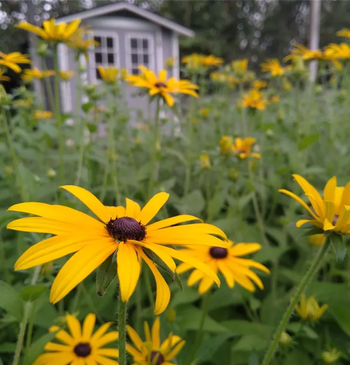 Schöner Korbblütler aus den Nordamerikanischen Prärien: Dieser Sonnenhut ist ein wunderbar ausdauernder Spätsommerblüher. Seine aufrechten, unverzweigten Stängel sind sehr stabil und brauchen keine Stütze. Zur Blütezeit schmücken sie sich mit zahlreichen gelben, sternförmigen Blüten, die eine dunkelbraune, halbkugelig aufgewölbte Mitte haben. Das eiförmige Laub ist zugespitzt und sitzt dicht über den ganzen Stängel verzweigt. Der Sonnenhut bildet kurze Ausläufer und gewinnt Jahr für Jahr an Umfang dazu. So entstehen mit der Zeit üppige, reichblütige Horste, die man im Beet gut mit Aster pyrenaeus Lutetia (Pyrenäen-Aster) und Salvia nemorosa (Steppen-Salbei) kombinieren kann. Besonders schön sind flächig gepflanzte, eingewachsene Bestände vor lichten Gehölzrändern. Gute Bienenweide. Gute Schnittblume. Passt in den Bauern- oder Landhausgarten.