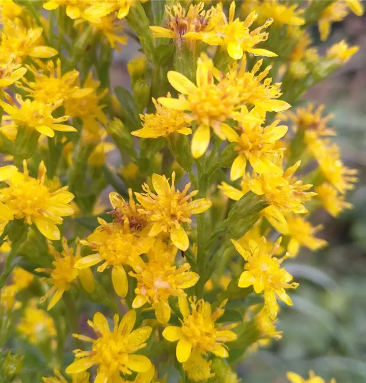 Eher unscheinbar, aber äußerst vielseitig: Die Echte Goldrute hat aufrechte, im unteren Bereich unverzweigte Stängel. Etwa ab der Stängelmitte verzweigen sie sich deutlich und enden in lockeren, rispigen Blütenständen. Diese sind gespickt mit zahlreichen, gelben Körbchenblüten, die gerne von Wildbienen, Schmetterlingen und den nützlichen Schwebfliegen besucht werden. Das Laub der Echten Goldrute ist unten gestielt und eiförmig. Weiter oben und bis in die Blütenstände hinein sitzen lanzettliche Blätter. Früher kamen Zubereitungen aus der Echten Goldrute bei Blasen- und Nierenleiden zum Einsatz. Auch schmerzstillende Wirkungen sind belegt. Zudem kann die Pflanze zum Färben von Wolle und anderen Naturfasern benutzt werden. Sie gibt einen goldgelben Farbton. Die jungen Triebe der Echten Goldrute können im Frühjahr übrigens zu Kochgemüse gegeben werden. Kochwasser weggießen! Wächst im Garten gerne mit Geranium sanguineum (Blut-Storchschnabel) und Scabiosa columbaria (Tauben-Skabiose).