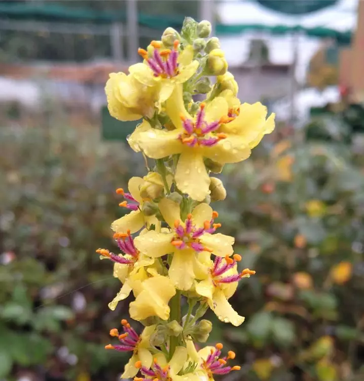 Wichtige Heilpflanze bei Husten: Für einen lindernden, schleimlösenden Tee nimmt man Blätter und Blüten. Äußerliche Anwendungen helfen gegen Prellungen und Entzündungen der Haut. Die zweijährige Schwarze Königskerze bildet einen dichten Blattschopf aus langgestieltem, frischgrünem Laub. Ihre großen, herzförmigen Blätter sind oberseits kahl, unterseits filzig behaart. Weiter oben ist das Laub kleiner und länglich-eiförmig. Von stabilen, unverzweigten und zumeist rötlich überlaufenen Stängeln getragen erscheinen dann kerzenartige Blütenstände. Sie schmücken sich überreich mit gelben Schalenblütchen, in deren Mitte strahlend violette Staubgefäße sitzen. Die von oben nach unten aufblühenden Blütenstände passen in naturnah gestalteten Flächen mit Wiesencharakter gut zu Salvia nemorosa (Steppen-Salbei) und Anthemis tinctoria Alba (Färber-Hundskamille in weiß). Auch im sonnigen Staudenbeet und bei lichten Gehölzen ist die Schwarze Königskerze immer ein Hingucker. Die Blütenstände kann man nach dem Verblühen an der Pflanze belassen. Sieht im Winter gut aus im Beet und hilft der Pflanze, sich durch Selbstaussaat zu erhalten.