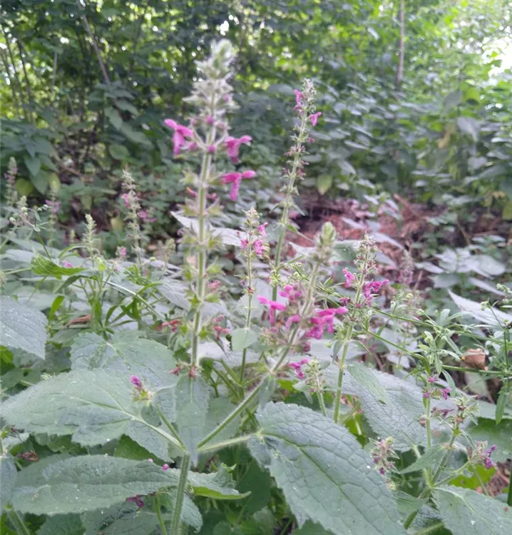 Duftet angenehm fliederartig: Der Wald-Ziest eignet sich toll für Beete mit Wald-Charakter, z.B. zusammen mit Salvia glutinosa (Klebriger Salbei) und Aruncus dioicus (Wald-Geißbart). Oder man pflanzt ihn in größeren Gruppen zu lichten Gehölzen, wo er ungestört verwildern kann. Sein leuchtend grünes, herzförmiges Laub hat gesägte Blattränder, ist lang gestielt und sitzt locker über den aufrechten, etwas verzweigten Stängel verteilt. Die großen, violetten Lippenblüten des Wald-Ziests stehen in lockeren, quirlartigen Gruppen zusammen, die etagenartig übereinander angeordnet sind und scheinährige Blütenstände ergeben. Seine knolligen Wurzeln können übrigens zubereitet werden wie Kartoffeln oder Spargel. Als Blattgemüse gekocht oder roh in den Salat geschnitten, kommen im Frühjahr die jungen Triebe und Blätter zum Einsatz. Zum Würzen kann der Wald-Ziest auch getrocknet verwendet werden. Gibt Pilzgerichten eine sehr besondere Note. Gute Bienen- und Schmetterlingsweide.