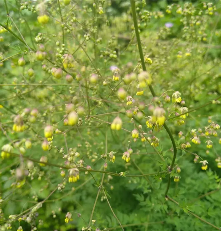Hübsche Staude für feuchte Gartensituationen: Der apart dunkelrot überhauchte Stängel der Kleinen Wiesenraute wächst locker verzweigt. Über den unteren Bereich der Pflanze verteilt sitzt mehrfach gefiedertes Laub mit rundlichen, bläulich-grün überlaufen Blattabschnitten. Der Stängel endet in einem locker verzweigten, rispigen Blütenstand aus zahlreichen, nickenden Blütchen in hellem Gelb. Die strahligen Blüten werden gerne von Wildbienen besucht. Im Garten bevorzugt die Kleine Wiesenraute einen trockenen Waldrand oder einen humosen Patz unter einem Laubbaum und zusammen mit Anthericum liliago (Astlose Graslilie), Asarum europaeum (Gewöhnliche Haselwurz) und Geranium nodosum (Knotiger Strochschnabel) gepflanzt ergibt sich eine natürliche Pflanzengemeinschaft.