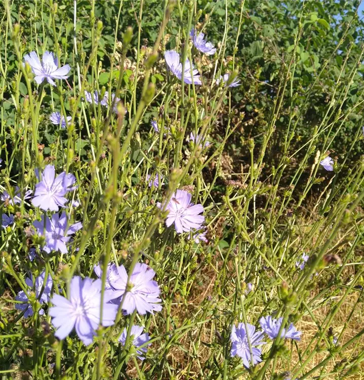 Machtvolle Zauberpflanze der alten Ägypter und Germanen: In einem ägyptischen Papyrustext von Plinius aus dem 4. Jahrtausend v. Chr. ist zu lesen: Wenn man sich mit dem mit Öl vermischten Saft der ganzen Pflanze salbe, so würde man von anderen mehr Gunstbezeigungen und alles, was man wolle, erhalten. Auch die Germanen sagten ihr nach, mit ihrer Hilfe könne man verschlossene Türen ebenso öffnen wie verschlossene Herzen. Sie machte hieb- und stichfest, gab dem Träger Bärenkräfte und brachte ihm Schönheit und Liebe. Und nicht nur deshalb lohnt es sich, die Wegwarte im eigenen Garten anzusiedeln. Diese wunderschöne Pflanze vermittelt eine beruhigende Leichtigkeit und vertreibt müde, schwerfällige Gedanken. Sie liebt sonnige Plätze, die sie sich gerne teilt mit der Roten Spornblume (Centranthus ruber) und der Weißen Sorte Centranthus ruber Albus. Schneidet man im Rhythmus von ca. 4 Wochen immer einzelne Pflanzen aus dem Bestand bodennah zurück, treiben sie neu aus und blühen bis zum Herbst durch. Die blauen Körbchenblüten der Wegwarte bestehen aus zweireihig angeordneten Zungenblüten. Sie sitzen endständig auf sparrig verzweigten Stängeln mit länglich-lanzettlichem Laub. Die jungen Blätter kann man im Salat oder in gekochter Form verwenden. Sie haben eine reinigende und entschlackende Wirkung auf den Organismus und die Haut. Der herbe bis bittere Geschmack lässt sich durch Überbrühen mit kochendem Salzwasser (2 TL Kochsalz auf 1 Liter Wasser), das nach 2 bis 3 Minuten abgegossen wird, deutlich mildern. Nahrungspflanze für Wildbienen, Fliegen und Käfer.
