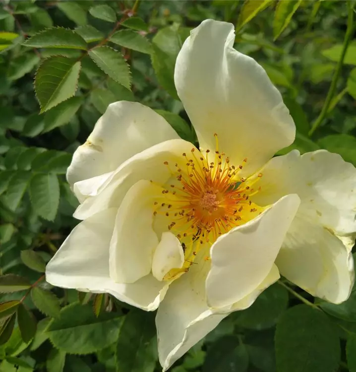 Starker Wuchs bis 150 cm Höhe. Laub mattgrün. Blüten hellgelb, sehr groß, ungefüllt, leichter Duft. Reiche Blüte im ab Juni und danach. Im Spätsommer erscheinen viele gelborangefarbene Hagebutten. Blüt auch im Halbschatten noch sehr gut.