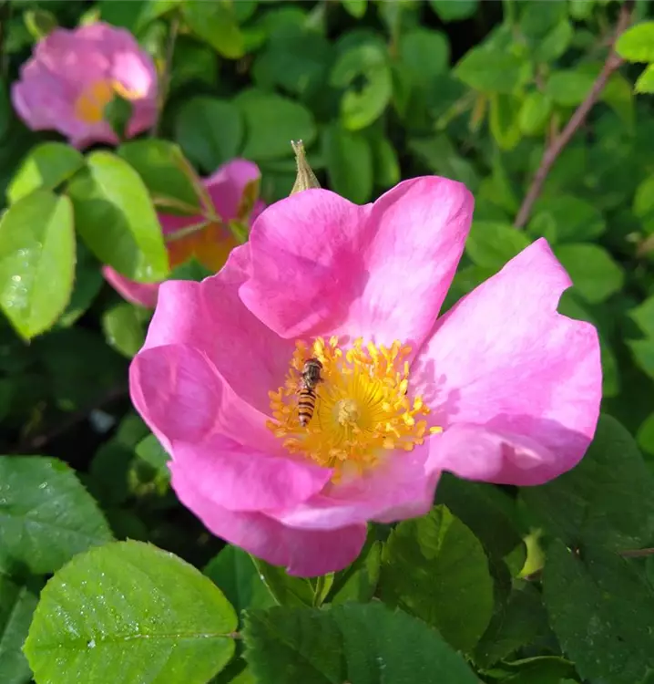 Kriechender, buschiger, verzweigter Wuchs mit hell- bis mattgrünen Blättern. Wird 30 bis 50 cm hoch und macht keine Ausläufer. Sehr große rosafarbene, ungefüllte Blüten von Mai bis Juni mit schwachem Duft. Reichlich orangerote Hagebutten (1,5 cm lang) ab September. Braucht einen sonnigen bis halbschattigen Standort und ist hitzeverträglich.