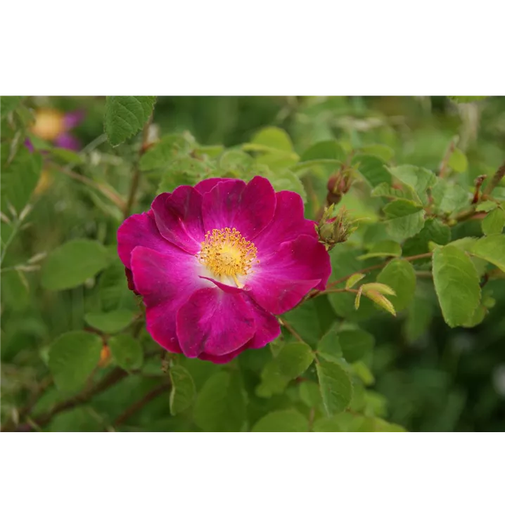 Hoher, breit aufrechter Wuchs (bis 150 cm breit) im Gegensatz zu den anderen Gallica-Rosen. Die zuerst steil aufrecht wachsenden, fast stachellosen jungen Zweige hängen später über und verzweigen sich gut. Das üppige dunkelgrüne, runde Laub verfärbt sich im Herbst bräunlich und hält sich bis in den Winter am Strauch. Die spitzen Knospen erscheinen früh und sind von auffallend langen Kelchblättern umgeben. Im Juni erscheinen samtig dunkelrote, mittelgroße und locker gefüllte Blüten mit goldgelben Staubgefäßen in der Mitte. Sie verströmen einen leichten, angenehmen Duft. Im Spätsommer erscheinen kugelige, rote Hagebutten und hängen bis in den Winter hinein am Strauch. Es handelt sich hier um eine sehr winterharte und widerstandsfähige Sorte gegenüber Krankheiten.