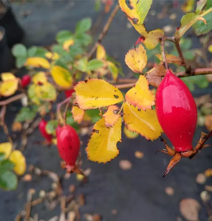 Bis zu 400 cm hoher, locker und breit wachsender Strauch mit ziemlich dicken Trieben, dessen Zweige in den oberen Partien kaum Stacheln aufweisen und dessen Blätter sich im Herbst gelb einfärben. Die einzeln stehenden, zartrosa Blüten sind ziemlich groß. Im Herbst bilden sich flaschenförmige, ziegelrote Hagebutten mit sehr hohem Vitamin C-Gehalt aus, die gut zur Herstellung von Marmelade und Tee verwendet werden können.