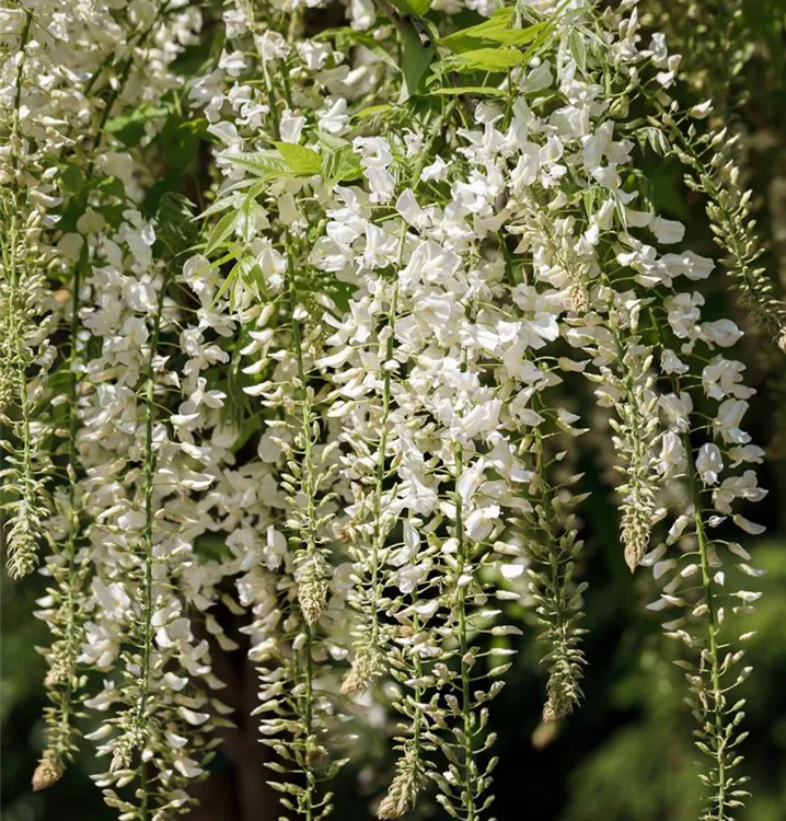 Warum nicht mal ein weißer Blauregen? Die weiße Sorte des Chinesischen Blauregens ist ebenso wüchsig und blühfreudig wie die blaublühende Verwandte. Wuchshöhe 6-10 m. Und ebenso robust. Ihr gefiedertes Laub ist frischgrün. Im Winter ist die Pflanze nicht belaubt. Dafür schenkt sie uns im April/Mai einen spektakulären Blütenhöhepunkt im Garten. Die weißen Blütenstände hängen in lockeren Trauben herab und verschönern Hauswände, Laubengänge und lauschige Sitzplätze im Garten. Die stark wachsende Kletterpflanze braucht für ihre verholzenden Triebe eine Rankhilfe. Wer sich eine besonders üppige Blüte wünscht, sollte den Blauregen nicht zu hoch werden lassen. Gut frosthart, wegen der frühen Blütezeit aber etwas empfindlich bei Spätfrösten im Frühjahr.