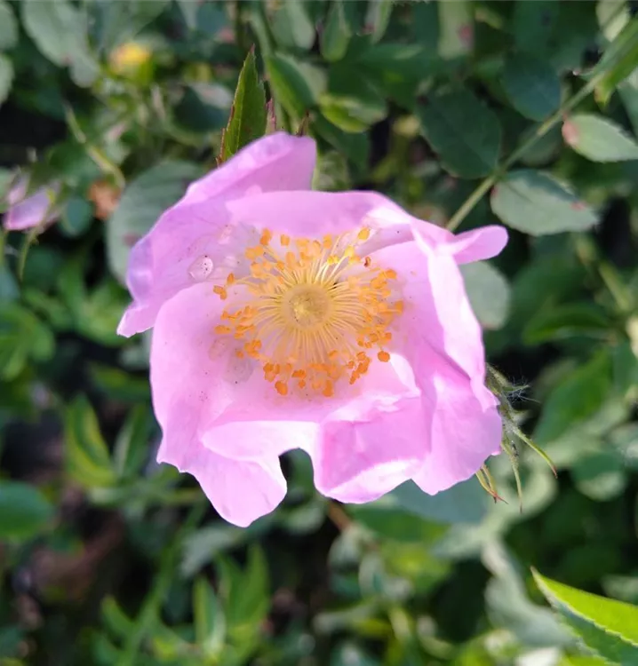 Gedrungener Wuchs mit bogig überhängenden, anfangs grünen, bläulich bereiften und später bräunlichen Zweigen. Wird 100 bis 350 cm hoch und bis 150 cm breit. Die Zweige sind mit hakigen Stacheln und graugrünen glänzenden Blättern besetzt. Blüht im Mai/Juni mit meist einzelstehenden großen, hellrosa Blüten, die leicht duften. Kugelige bis bauchige, orangerote, glatte Hagebutten reifen ab August/September. Bevorzugter Standort sind sonnige bis halbschattige, nährstoff- und kalkreiche, auch sandig-steinige Lehmböden. Rosa dumalis macht keine Ausläufer.