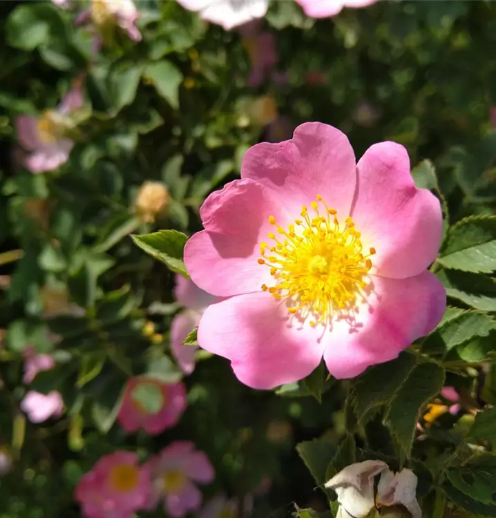 Dies ist eine kräftig wachsende, überhängende Strauchrose, die 200 bis 300 cm hoch und im Alter breiter als hoch wird (tiefwurzelnd). Ihre anfangs grünen, später braunen Zweige haben viele gekrümmte Stacheln. Sie blüht reichlich von Mai bis Juni mit hellrosa bis schwach roten, manchmal auch mit reinweißen Blüten, die lieblich duften. Die scharlachroten, eiförmigen Hagebutten reifen von Oktober bis November und sind reich an Vitamin C. Bevorzugte Standorte sind mäßig trockene, tiefgründige Lehm- oder Lößlehmböden, die mäßig sauer bis kalkhaltig und auch stickstoffhaltig sein können. Sie liebt es sonnig, ist aber auch sehr windverträglich und macht keine Ausläufer.