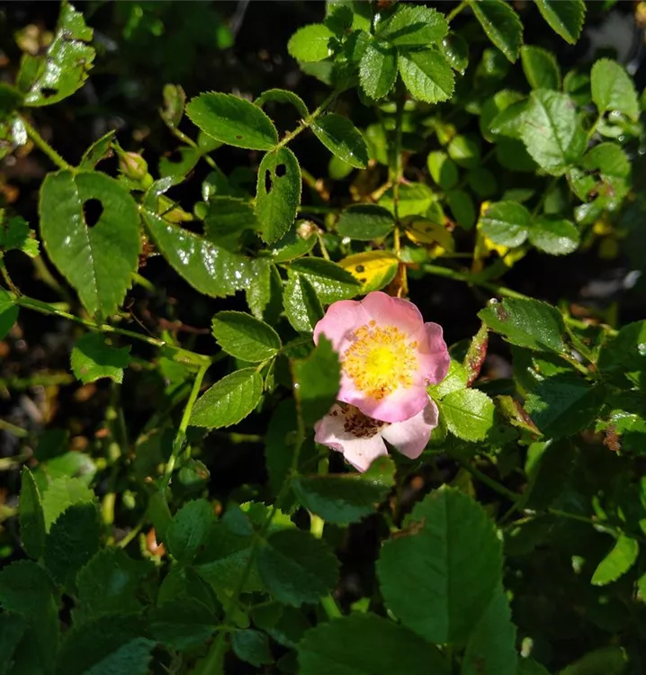 Wächst ziemlich dicht mit überhängenden, mäßig stacheligen und leicht bereiften grünen Zweigen zwischen 150 und 200 cm (auch bis 300 cm) hoch und etwa 120 cm in die Breite. Das dunkelgrüne Laub fühlt sich an der Unterseite und am Stiel durch Drüsen und Drüsenborsten „rau“ an und hat einen schwachen Apfelduft. Die ziemlich großen hell- bis dunkelrosa Blüten mit starkem Rosenduft blühen einzeln oder in kleinen Büscheln von Juni bis Juli. Reichlich leuchtend rote, rundliche bis ovale Hagebutten bilden sich von September bis Oktober und bieten einen langanhaltenden Fruchtschmuck. Bevorzugter Standort sind trockene, steinige und kalkhaltige Lehmböden mit viel Sonne und Wärme. Sie bildet wenig Ausläufer.