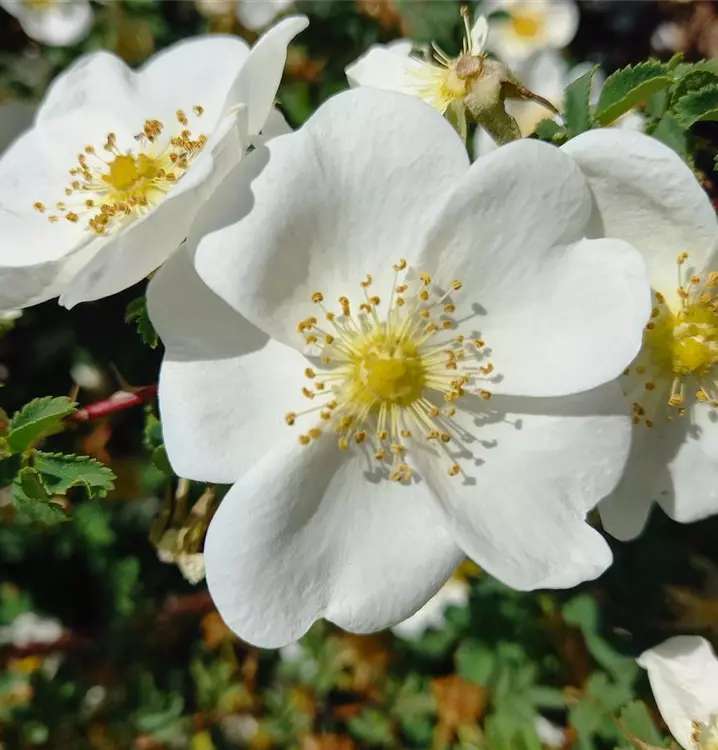 Aufrechter, stark verzweigter Wuchs (50 bis 150 cm, auch 200 cm hoch, 150 cm breit). Die anfangs grünen und aufrecht wachsenden Zweige werden im Alter rotbraun und biegen sich unter den Blüten und Früchten. Sie sind dicht mit nadelartigen Stacheln und Borsten besetzt, woher sich der alte Name 'spinosissima' erklärt, was 'sehr stachlig' bedeutet. Der Name 'pimpinellifolia' bezieht sich auf die pimpinellenartig zusammengesetzten Blätter, die sich im Herbst rötlichbraun färben. Reichlich duftende Blüten erscheinen bereits ab Anfang Mai in cremeweiß mit auffälligen gelben Staubgefäßen. Die kugeligen, meist braunschwarzen Hagebutten mit Kelchblättern sind schon ab Juli ausgereift. Bevorzugter Standort des sehr windfesten Strauches ist ein magerer, flachgründiger, sandiger oder felsiger, kalkhaltiger Boden in voller Sonne. Sie bildet viele Ausläufer und Kolonien.