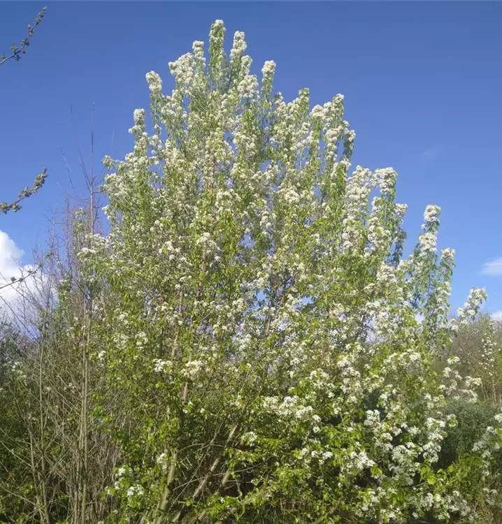 Die Steinweichsel, Felsen- oder Weichsel-Kirsche wird bis zu 5 m hoch und wächst als kleiner Baum oder Großstrauch. Der kurze Stamm und die unregelmäßig breiten, aufrecht wachsenden Hauptäste haben eine grüne, später graubraune Rinde. Ab Anfang April bis Mai erscheinen bis zu 10 weiße, 1 cm große Blüten in einer Doldentraube. Man spricht auch von nektarführenden Scheibenblüten. Im August/September sind daraus 1-samige, bitter schmeckende, anfangs gelb-grüne, später bläulich-schwarze Beeren geworden. Vögel schälen sich das Fruchtfleisch als Nahrung ab. Die Blätter sind glatt, glänzend, rundlich-eiförmig mit aufgesetzter Spitze und kurzen stumpfen Kerbsägen. Das kräftige Wurzelsystem ist tief und ausgebreitet. Die Steinweichsel ist kalkliebend, bevorzugt neutralen bis stark alkalischen Boden und kommt mit durchlässigen Lehmböden klar. Auch rohe und trockene Standorte sind kein Problem. Ist Stadtklimafest und rauchhart.