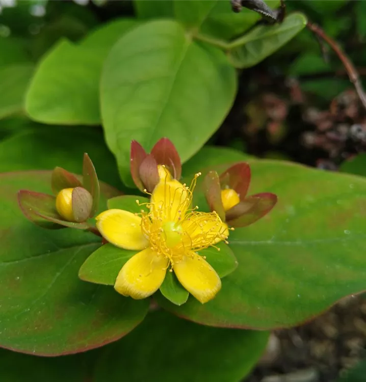 Zerreiben Sie die Pflanzenteile, so tritt ein roter Saft hervor. Die auffällig roten Früchte beinhalten einen roten Saft. Im Deutschen ist der ca. 30 - 50 cm hoch werdende Halbstrauch deshalb auch unter dem Namen Mannsblut oder Blut-Johanniskraut bekannt. Er ist immergrün, dicht verzweigt, mit kriechenden als auch aufsteigenden Zweigen und wird so hoch wie breit. Von Juni bis August erscheinen viele gelbe ca. 2,5 cm große, fünfzählige Blüten und nähren Hummeln und Bienen. Die Zweige sehen hübsch in der Vase aus und werden in der Floristik verwendet. Ab August reifen rote kugelige Beeren heran, die sich später schwarz glänzend einfärben. Ein wunderschönes Farbenspiel. Die ledrigen, ganzrandigen Blätter sind stumpf-eiförmig, bis 10 cm lang und ca. halb so breit, oberseits stumpf-grün, unterseits blau-grün und durch Öldrüsen durchscheinend punktiert. Der Strauch ist recht anspruchslos und mag es gerne gleichmäßig feucht. Er eignet sich als Einzel- oder Gruppengehölz. Schneidet man die Pflanze nach dem Winter bis auf den Wurzelstock zurück, treibt sie im Frühjahr wieder aus.