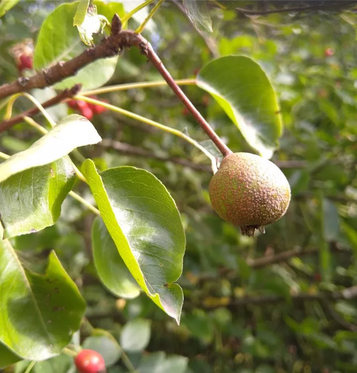 Mittelgroßer Baum, der 6-8 m hoch wird, dessen Stamm gerade durchgehend bis in die breit kegelförmige Krone geht. Die grauweiße Rinde wird später rissig. Das Wurzelsystem ist ein tiefgehendes Herzwurzelsystem mit Pfahlwurzeln. Tiefwurzeler dringen in verdichtet Böden, sind wenig verzweigt und haben nur wenige Feinwurzeln. Die Haupt- und Nebenwurzeln zeichenen sich durch Stärke und Zähigkeit aus, dadurch eine gute Windverankerung. Die 8 cm langen eirunden bis eliptischen Blätter sind dunkelgrün glänzend und verfärben sich im Herbst orange-gelb. Die weißen Blüten erscheinen im April bis Mai ca. 1 Woche in zottig behaarten Doldentrauben. Im Herbst trägt der Baum ca. 5 cm lange, birnenförmige bis fast kugelige, herbsauere eßbare gelbgrüne Früchte. Pyrus pyraster eignet sich als Einzelgehölz in Gärten, Parkanlagen und Industriegebiete, aber auch als Verkehrsbegleitgrün. Das Klima in Städten ist kein Problem. Verträgt gut Hitze- und Trockenperioden. Sie bevorzugt nährstoff- und basenreiche kultivierte Böden.