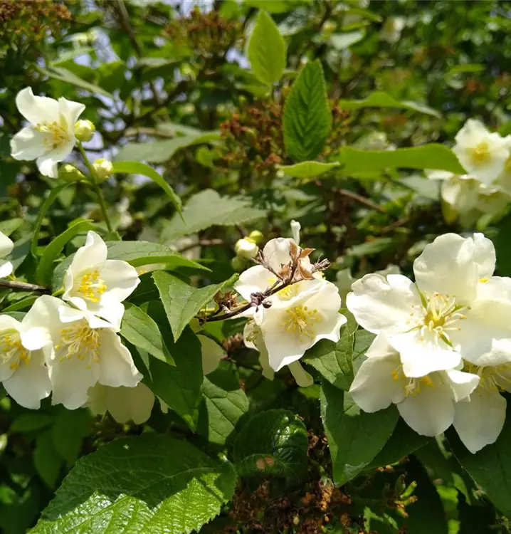 Im Deutschen wird dieser 1 - 2 m hohe Strauch auch Falscher Jasmin, Bauernjasmin oder Pfeifenstrauch genannt. Der letzte Name führt darauf zurück, dass das Mark im Inneren der Zweige sich leicht entfernen lässt und die Kinder früher gerne daraus Pfeifen herstellten.