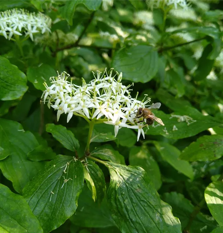 Der in Mitteleuropa heimische Rote Hartriegel ist ein beliebtes Gehölz für Hecken. In Kombination mit Eingriffligem Weißdorn (Crataegus monogyna), Blauer Heckenkirsche (Lonicera caerulea) und Wein-Rose (Rosa rubiginosa) schaffen Sie einen tollen Sichtschutz für Ihren Garten und gleichzeitig eine Kinderstube für die Raupen vielerlei Schmetterlingsarten. Und natürlich punktet der Rote Hartriegel mit der leuchtend roten Herbstfärbung seines eiförmigen Laubes. Die Blütenknospen erscheinen beim Roten Hartriegel an den Enden der Zweige. Sie erblühen zu weißen Schirmrispen, die bei Wildbienen sehr begehrt sind. Im Herbst erscheinen schwarzblaue Früchte, die gerne von Amseln & Co. genascht werden.