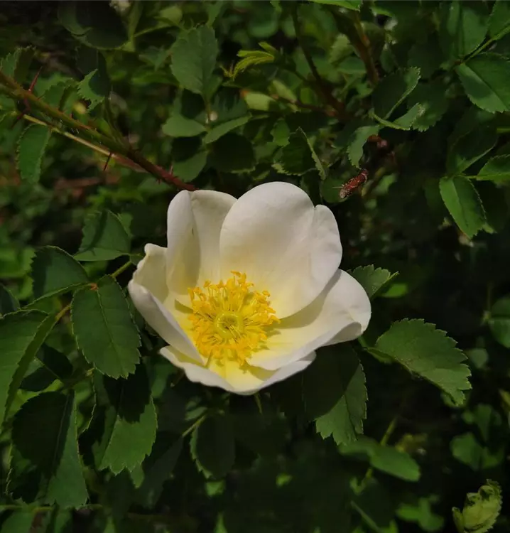 Aufrechter, stark verzweigter Wuchs, zwischen 40 bis 80 cm hoch werdend . Die anfangs grünen und aufrecht wachsenden Zweige werden im Alter rotbraun und biegen sich unter den Blüten und Früchten. Sie sind dicht mit nadelartigen Stacheln und Borsten besetzt, woher sich der alte Name 'spinosissima' erklärt, was 'sehr stachlig' bedeutet. Der Name 'pimpinellifolia' bezieht sich auf die pimpinellenartig zusammengesetzten Blätter, die sich im Herbst rötlichbraun färben. Reichlich duftende Blüten erscheinen bereits ab Anfang Mai in cremeweiß mit auffälligen, gelben Staubgefäßen. Die kugeligen, meist braunschwarzen Hagebutten mit Kelchblättern sind schon ab Juli ausgereift. Bevorzugter Standort des sehr windfesten Strauches ist ein magerer, flachgründiger, sandiger oder felsiger, kalkhaltiger Boden in voller Sonne. Sie bildet viele Ausläufer und Kolonien.