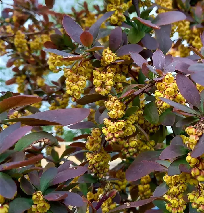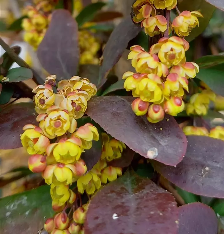 Diese Berberitze unterscheidet sich zum gewöhnlichen Sauerdorn lediglich – wie der Name Atropurpurea schon sagt - durch ihre rötlichen Blätter. Die hängenden gelben und leicht rotgefärbten Blütenblätter sind genauso hübsch wie im Herbst die länglichen orangeroten bis dunkelroten Beeren. Die meiste Verwendung finden die Beeren als Säure- und Aromaträger für Säfte, Gelees und Marmeladen mit Birnen oder süßen Apfelsorten. Der bis zu 3 m hoch wachsende Strauch liebt Kalkböden in vollsonniger Lage. An diesem Standort ist die Berberitze als Fruchtgehölz auch sehr ertragreich. Recht gut gedeiht sie aber auch auf allen mageren Standorten in sonniger bis halbschattiger Lage. Eignet sich mit ca. 4 Pflanzen pro Meter auch gut als Heckenpflanzung.