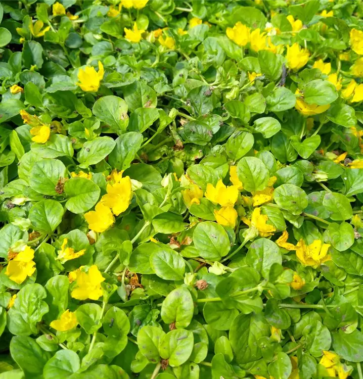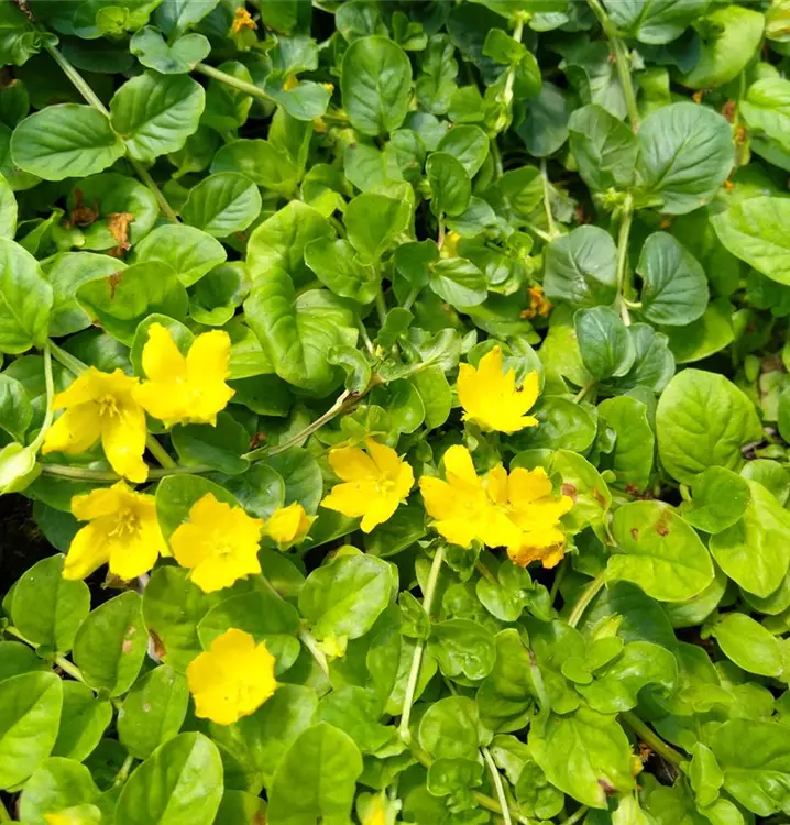 Bodendecker für frische-feuchte Standorte: Besonders wohl fühlt sich das Pfennigkraut im Garten an Teichrändern. Hier kann es, zwischen Ajuga reptans Purple Torch (Rotlaubiger Günsel) und Carex pseudocyperus (Scheinzypergras-Segge), besonders gut als Bodendecker eingesetzt werden. Seine kaum verzweigten Stängel wachsen kriechend am Boden und bewurzeln an den Blattknoten. So entstehen mit der Zeit dichte, sattgrüne Polster, die zur Blütezeit durchsetzt sind mit gelben, schalenförmig ausgebreiteten Blütchen. Sie erscheinen zahlreich in den Blattachseln und sind innen rötlich punktiert. Die kleinen Laubblätter des Pfennigkrauts sind rundlich und können, wie die jungen Triebe, als Beigabe zu Salaten oder Gemüse gegeben werden. Will man es in der Küche verwenden, kann man es auch im Topf kultivieren, um es so leichter beernten zu können.
