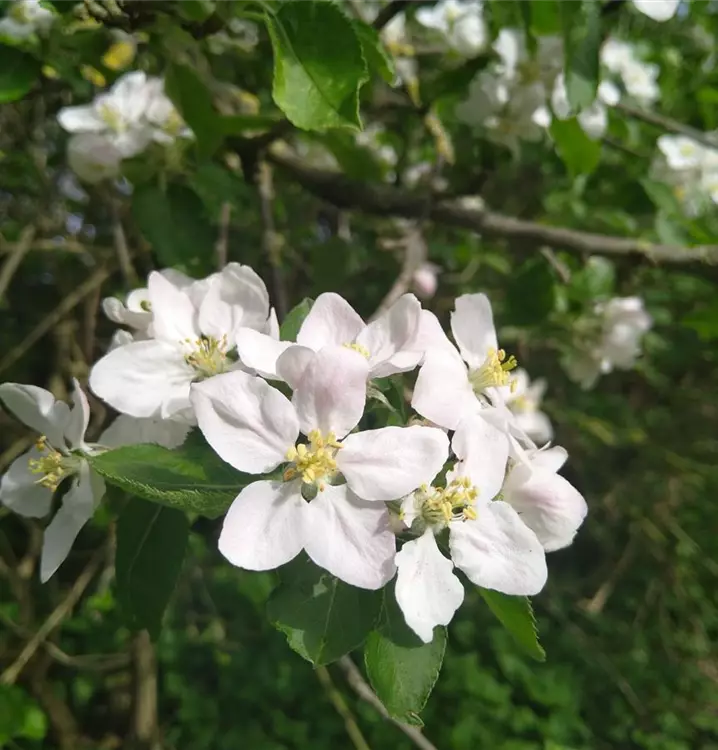 Der Holzapfel ist ein sommergrüner, kurzstämmiger Baum bzw. Großstrauch. Die durchschnittliche Größe liegt zwischen 6 - 8 m. Aus den wolligen Knospen entwickeln sich rosa-weiße Blüten, welche im April/Mai erscheinen. Bis Oktober hängen kugelige, gelb-grüne Äpfel mit roten Bäckchen an Ästen und Zweigen mit verdornenden Kurztrieben. Die Früchte schmecken leicht säuerlich und holzig. Die Blätter sind ganz schwach behaart, eiförmig gezahnt und ca. 4 - 8 cm lang. Die graubraune Rinde weist längsrissige Schuppenborken auf. Kalkhaltige, schwach saure bis alkalische Böden liebt dieser Wildapfel. Er ist zur Heckenpflanzung geeignet und auch in unserem Paket 1.00 Vogelschutzhecke enthalten.