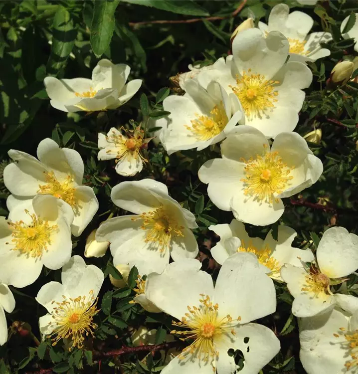 Wie Rosa pimpinellifolia (spiosissima), aber flachwachsend (30 bis 50 cm hoch und 60 bis 80 cm breit) mit langen, dichtbestachelten Seitentrieben und kleingefiedertem, dunkelgrünem Laubwerk. Blüht früh und reichlich von April bis Mai mit leicht duftenden, cremeweißen, einfachen Blüten (4 - 5 cm groß) und auffallenden, goldgelben Staubgefäßen. Ab August erscheinen kugelrunde, 1 cm große, schwarze Hagebutten. Verträgt sonnige bis halbschattige Standorte und ist wegen des kriechenden Wuchses gut als Bodendecker, aber auch als Einzelstrauch oder Vorpflanzung für Hecken geeignet. Sie macht viele Ausläufer.