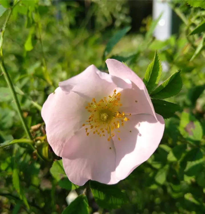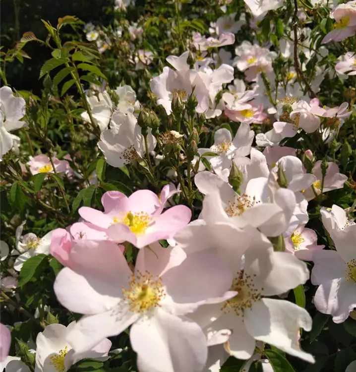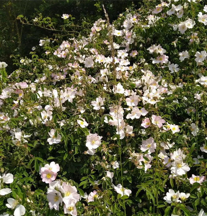 In der Natur entstandene Kreuzung zwischen Rosa arvensis und Rosa gallica. Kriechender, nur leicht kletternder Wuchs bis 40 cm Höhe und 100 cm Ausdehnung (mit Kletterhilfe bis 150 cm Höhe) mit dunkelgrünen Trieben und bläulich-grünem, festem Laub. Die Triebe sind mit rötlichen, hakigen Stacheln besetzt. Von Juni bis Anfang Juli einzeln stehende, einfache, ziemlich große und leicht duftende Blütenpracht in einem hellen Rosa. Orangerote, ovale bis runde Hagebutten ab September. Bevorzugter Standort sonnig bis halbschattig und windgeschützt auf trockenen, nährstoff- und kalkreichen, lehmigen oder lößlehmigen Böden.
