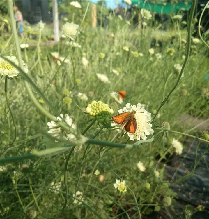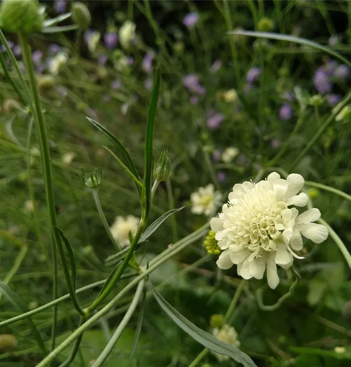 Blüht ausdauernd vom Sommer bis in den November: Diese Gelbe Skabiose ist die einzige gelbblühende Skabiose in der sonst überwiegend blau, violett, manchmal auch rosa blühenden Familie. Mit ihren kugeligen, auf dünnen, verzweigten Stängeln schwebenden Blütenköpfchen kann man sie in sonnigen Beeten oder Rabatten gut zusammen mit Malva moschata Alba (Weiße Moschus-Malve) und Stipa calamagrostis (Silber-Ährengras) kombinieren. Fühlt sich die Gelbe Skabiose an ihrem Standort wohl, verbreitet sie sich zuverlässig durch Selbstaussaat und bildet bald herrliche, üppig blühende und doch luftig wirkende Bestände. Auf Wiesen sieht das sehr schön aus. Oder bei lichten Gehölzrändern. Hier bedecken die gefiederten, grundständigen Laubhorste der Gelben Skabiose auch gut den Boden und unterdrücken zuverlässig aufkeimendes Unkraut.