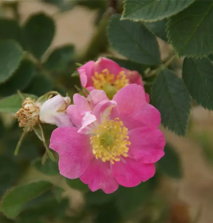 Ähnelt Rosa villosa. Überhängender, buschiger Wuchs (50 bis 150 cm hoch, 90 cm breit). Graues, unterseits dicht behaartes „weiches“ Laub an bläulich bereiften Trieben. Die rosafarbenen und zart duftenden Blüten erscheinen im Juni/Juli in kleinen Büscheln. Sehr früh reifende, kugelige, scharlachrote Hagebutten mit Kelchblättern ab August. Bevorzugter Standort sind kalkhaltige oder kalkfreie, flachgründige Sand- oder Steinböden mit Sonne bis Halbschatten. Sie macht keine Ausläufer.