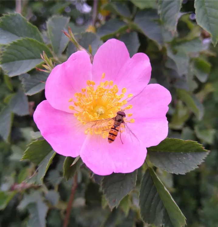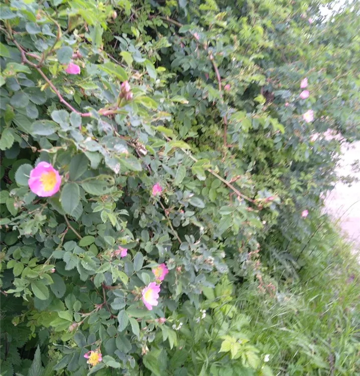 Dunkles Laub an straff aufrechtwachsendem Strauch, 1-2 m hoch. Im Mai/Juni weiße bis fleischfarbene, blassrote Blüten. Im Herbst auffällige, borstige Hagebutten. Für durchlässige, auch magere Böden.