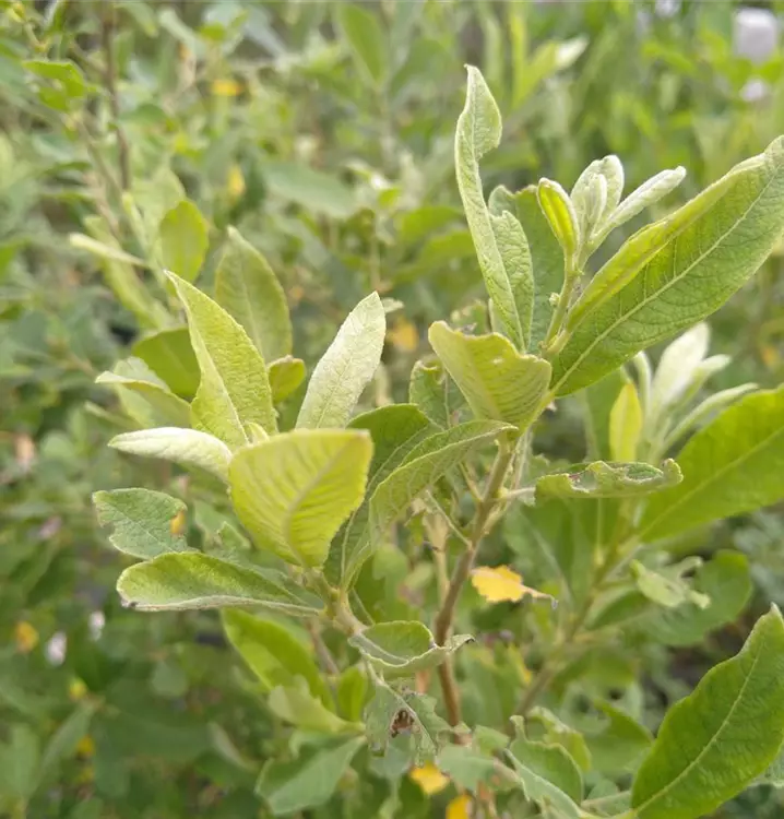 Graue oder auch Asch-Weide genannt, da die Blätter oberseits aschgrau und unterseits grau- bis grün-blau gefärbt sind. Der Großstrauch mit 4 - 6 m Höhe wächst halbkugelig, dicht verzweigt und mit dicken Grundästen, die bogig aufrecht, im Alter breit ausladend werden. Im März/April, vor dem Austreiben der 6 - 10 cm langen, verkehrt-eiförmigen Blätter und nierenförmigen Nebenblätter erscheinen die gelblich-grünen, 6 cm langen Kätzchen. Somit ist sie eine wichtige, frühe Nahrungsquelle für Bienen, Hummeln und Schmetterlinge. Die Kätzchen sind nach ca. 5 Jahren zweihäusig. Die Wurzeln mit teilweise verfilzenden Wurzelbärten breiten sich flach aus und verzweigen sich dicht. Die Graue Weide ist kalkmeidend, mag es stark bis schwach sauer und ist für rohe Böden ein ideales Pioniergehölz. Verwendung als Gruppengehölz, Schutzpflanzung und Uferbegrünung für Gebiete, die auch mal länger überschwemmt werden.