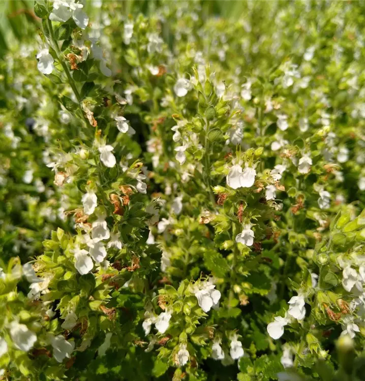 Schöne weißblühende Auslese: Der Edel-Gamander ist ein kleiner Halbstrauch aus der Familie der Lippenblütler, der heutzutage nahezu unbekannt ist. Das ist schade, denn die robuste, anspruchslos Pflanze eignet für vielerlei Gartensituationen. Im sonnigen trockenen Staudenbeet kann man ihn, im Vordergrund gepflanzt, mit Stauden in den unterschiedlichsten Farbtönen kombinieren. Schöne und sehr natürlich anmutende Gemeinschaften lassen sich z.B. mit Thymus praecox (Frühblühender Thymian) und Potentilla tabernaemontani (Frühlings-Fingerkraut) gestalten. Der Edel-Gamander ist mit seinem kompakten Wuchs auch hervorragend für die Dachbegrünung geeignet. Er bildet zügig Ausläufer und wächst so zu dekorativen, üppig blühenden Beständen heran. Seine weißen Lippenblütchen sind im oberen Bereich der Pflanze quirlartig angeordnet und bilden lockere, traubenartige Blütenstände. Das ovale, aromatisch duftende Laub ist am Rand deutlich gekerbt und wurde früher für vielerlei Heilanwendungen benutzt. Von der innerlichen Abwendung des Edel-Gamanders ist aus heutiger Sicht aber abzuraten, da er schädigend auf die Leber wirken kann. Gute Bienenweide.