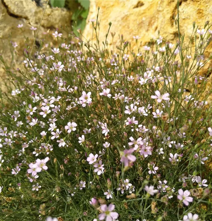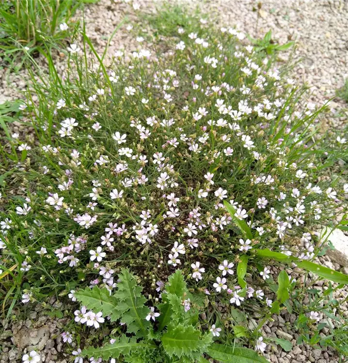 Kleines Nelkengewächs für Dach- und Steingarten: Die anspruchslose und extreme Trockenheit vertragende Steinbrech-Felsennelke macht sich auch gut auf der Krone von Trockenmauern und in den Fugen von Trittwegen. Sie entwickelt lange, dünne Stängel, die umspielt werden von grasartigen Laubblättern. So entstehen dekorative, halbkugelige Horste, die zur Blütezeit überzogen sind mit rosa Blütchen. Ähnlich wie beim Schleierkraut (Gypsophila), mit dem sie entfernt verwandt ist. Lässt man die Blüten ausreifen, entwickelt die kleine Wildstaude eine gehörige Menge Samen und breitet sich zügig zu hübschen Polstern aus. Lästig wird das freundliche Geschöpf aber nie. Zusammen mit Helianthemum nummularium (Gewöhnliches Sonnenröschen) und Linum perenne (Ausdauernder Lein) ergeben sich wunderbar natürlich wirkende Pflanzengemeinschaften. Gedeiht auch im Kübel oder Balkonkasten.