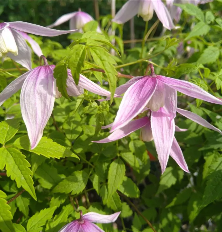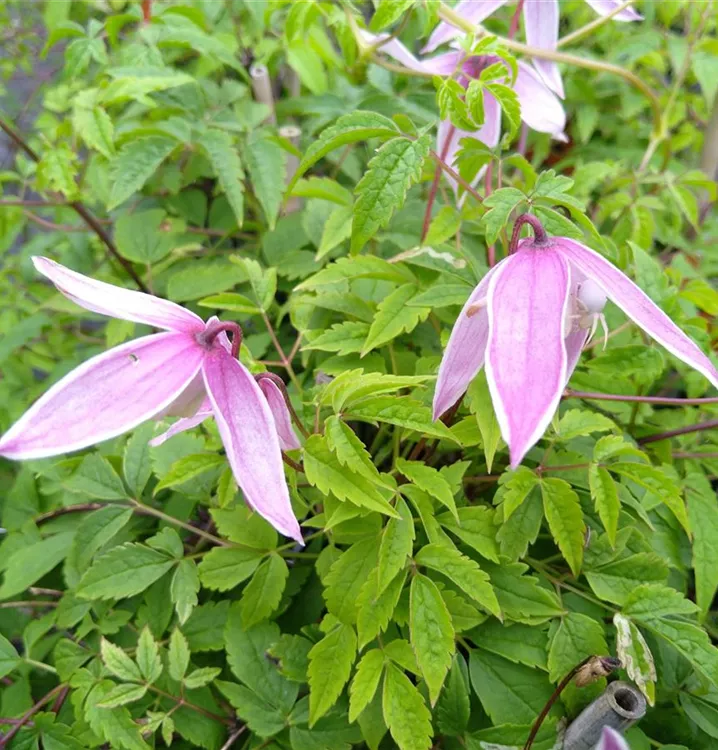 Hübsche purpurrosa Auslese mit weißem Rand: Die Alpen-Waldrebe Willy hat 4-5 cm große, ausgebreitete Glockenblüten. Sie blüht einmal im April/Mai. Schneidet man sie direkt nach der Blüte leicht zurück, blüht sie im Spätsommer (August) ein zweites Mal. Weitere Schnittmaßnahmen sind nicht nötig. Wie alle Clematis eignet sich auch diese 2-3 m hoch wachsende Sorte für die Begrünung von Pergolen, Lauben und als Sichtschutz. Sieht auch toll aus an einen alten Apfelbaum gepflanzt. Die Alpen-Waldrebe wächst nur mäßig in die Breite (1-1,4 m). Man kann sie daher auch im Kübel auf dem Balkon aufstellen. Sehr gesunde Sorte, die kaum frostempfindlich ist. Die federigen Samenstände der Alpen-Waldrebe sind übrigens eine dekorative Ergänzung in Blumensträußen und Kränzen. Gute Pflanzpartner sind Waldgeißblatt (Lonicera periclymenum Serotina). Rankhilfe erforderlich.