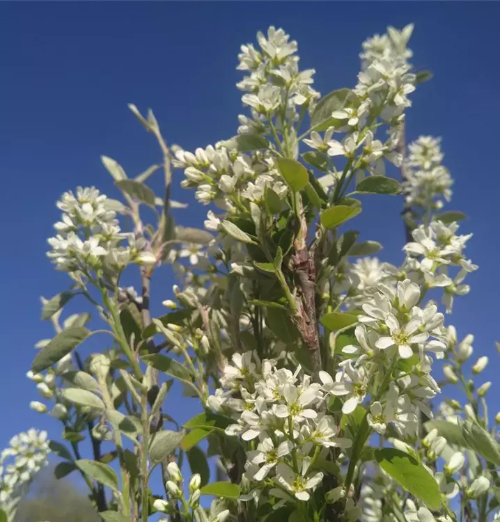 Die Gewöhnliche Felsenbirne wird 1,5 bis 2 m hoch und blüht im Frühling von April bis Mai in üppigen weißen Blütentrauben. Die dunkelviolettblauen Früchte werden ab Anfang Juli reif und sind süß und wohlschmeckend. Besonders für gemischte Kompotte bzw. frisch und getrocknet als Müsli-Beigabe. Das Laub färbt sich im Herbst gelb ein.