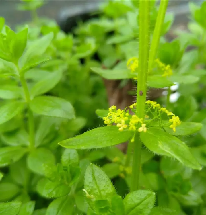 Gelblichgrün – sowohl Blüten wie Stängel: Manchmal sind die vierkantigen Stängel zusätzlich noch rot überlaufen. Das sieht schick aus und passt, z.B. zusammen mit Ononis spinosa (Dornige Hauhechel), Potentilla recta (Hohes Fingerkraut) und Prunella vulgaris (Gewöhnliche Braunelle) gut an Gebüschsäume. Das Gewöhnliche Kreuzlabkraut ist entfernt mit dem Waldmeister verwandt. Wie bei diesem sitzen die länglich-ovalen Blätter in Quirlen etagenartig übereinander. Stängel und Blätter sind abstehend behaart. Die Blüten des Gewöhnlichen Kreuzlabkrauts sind klein und sitzen, ebenfalls in Quirlen, in den Blattachseln.