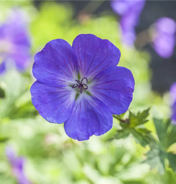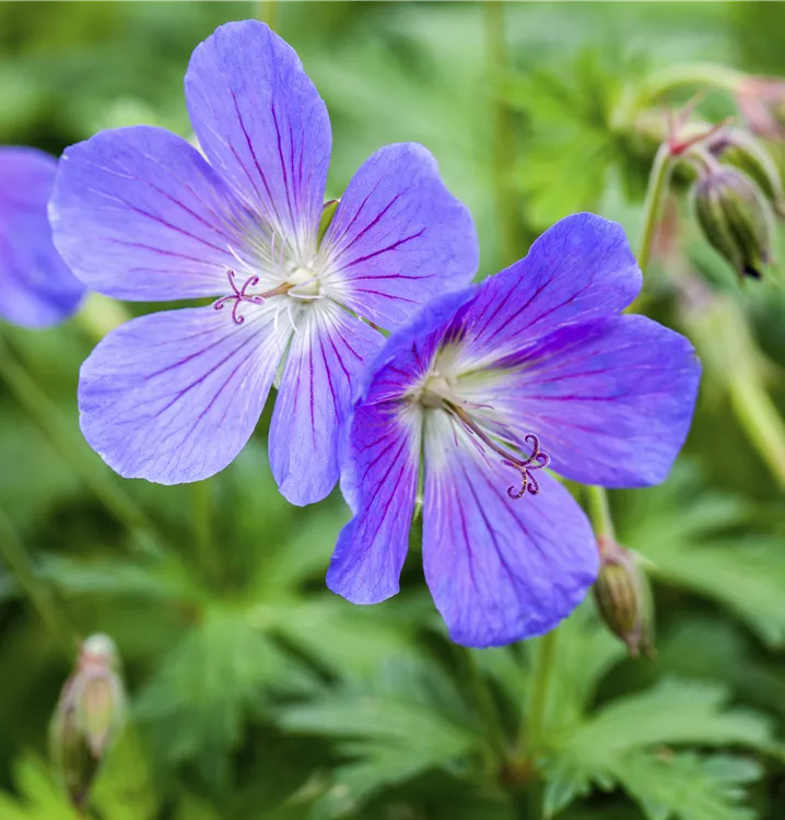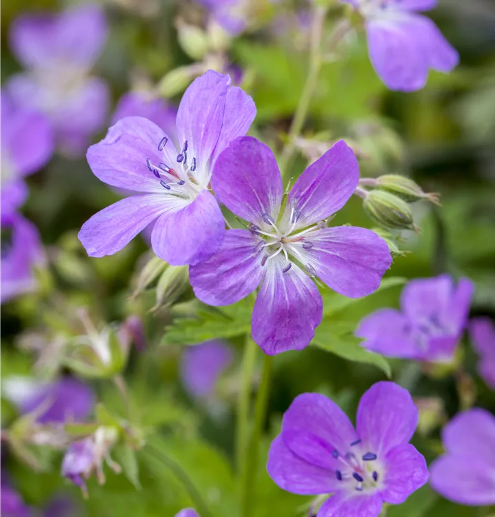 Mag es hell und warm: Der Wiesen-Storchschnabel hat einen lockeren, flächigen Wuchs. Er macht nur kurze Ausläufer und wird nie lästig. Außerdem punktet er mit einer langen Blütezeit. Es lohnt sich daher, den heimischen Wiesen-Storchschnabel im Garten anzusiedeln. Seine blauen Blüten sind fünfzählig und flach schalenförmig ausgebreitet. Sie sitzen endständig, meist zu zweit, auf aufrechten, verzweigten Stängeln. Die langgestielten, grundständigen Laubblätter sind in sieben Abschnitte geteilt, haben einen gekerbten Blattrand und bekommen eine schöne Herbstfärbung. Der buschige Wiesen-Storchschnabel passt in sonnigen Beeten oder Wiesenrabatten gut zu Silene flos-cuculi (Kuckucks-Lichtnelke) und der weißen Sorte White Robin.