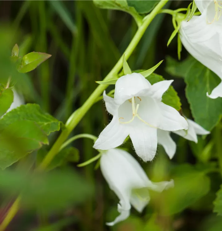 Sooo viele Blüten: Die Breitblättrige Glockenblume schmückt sich im Sommer mit einem üppigen Flor aus weißen Glöckchen. Die großen, nickenden Blüten sitzen in den oberen Blattachseln sowie endständig auf locker verzweigten Stängeln und lassen wunderbare, durchblätterte Blütentrauben entstehen. Ihr gesunder, robuster Charme passt gut in naturnahe Pflanzungen. Die weithin strahlenden Blüten dieser Glockenblume sind alle mehr oder weniger in die gleiche Richtung geneigt und ermöglichen, zusammen mit Aconitum napellus (Blauer Eisenhut), Aquilegia atrata (Schwarzviolette Akelei) und Osmunda regalis (Königsfarn), variantenreiche Pflanzungen. Und auch schon vor der Blüte ist die Breitblättrige Glockenblume mit ihrem horstigen Wuchs wichtiges Gestaltungselement im Beet. Die Stängelblätter sind oval-lanzettlich und sitzen etagenartig übereinander an den aufrechten, stabilen und manchmal leicht gerillten Stängeln. Die Grundblätter sind eher langgestreckt-eiförmig. Die Elternart dieser Sorte kommt wild in den Alpen, Sibirien und auch im Himalaja vor. Entsprechend robust und gesund sind die Breitblättrigen Glockenblumen. Man findet sie wild in der Nähe von Bächen und in lichten Laubmischwäldern. Dementsprechend sollte man auch ihren Standort im Garten wählen. An sehr sonnigen Standorten muss man ausreichend wässern. Ausläufer bildet diese Sorte nicht.