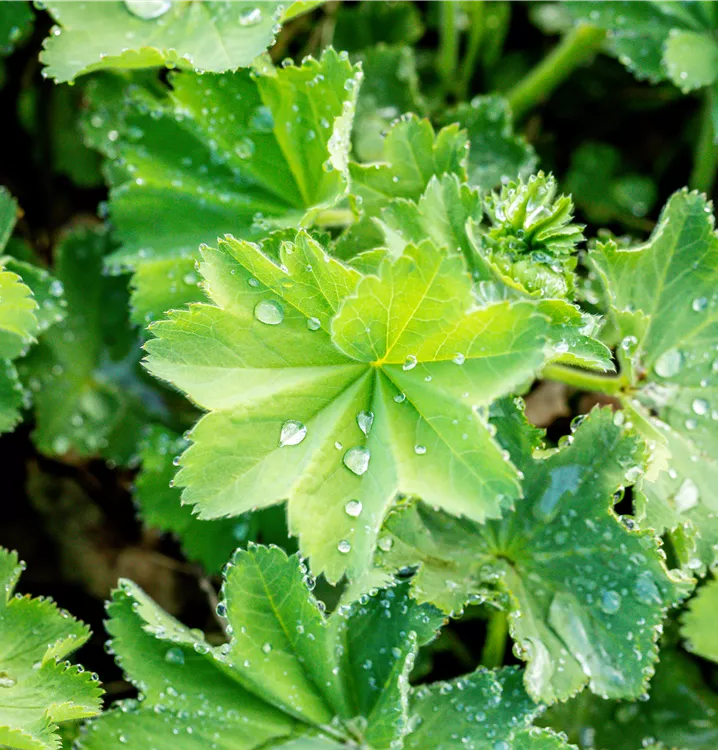 Alte Heilpflanze mit besonders hübschem Laub: Die gelappte Form der Laubblätter soll an den Mantel-(kragen) der Gottesmutter Maria erinnern, unter dem hilfesuchende Menschen Schutz finden. Aus diesen Blättern presst die Pflanze über Nacht Wassertropfen, die früh morgens an den Blatträndern hängen – heute ein beliebtes Fotomotiv, früher sagenumwobenes Elixier. Alte Geschichten erzählen davon, dass Blumen- und Waldelfen sich mit diesen Tropfen wuschen. Und für Magier waren sie begehrtes Zaubermittel, das mit allerlei Beschwörungen angewandt wurde. Der botanische Name Alchemilla erinnert nicht von ungefähr an Alchemie... Die klassische Medizin empfiehlt Frauenmantel bei akuten Durchfallerkrankungen und als Mittel bei der äußerlichen Wundbehandlung. Die Volksmedizin wendet ihn bei verschiedensten Frauenleiden oder als krampfstillendes und herzstärkendes Mittel an.