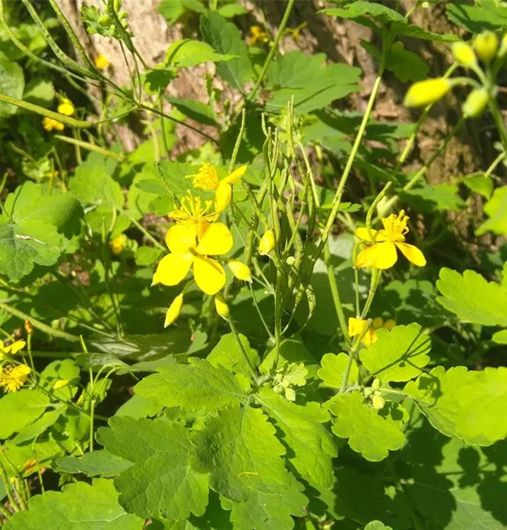 Goldkraut und Goldwurz. Sein botanischer Name wird abgeleitet von griech. chelidon = Schwalbe, da das Gewöhnliche Schöllkraut zu blühen beginnt, wenn die Schwalben aus ihrem Winterquartier im Süden in heimische Regionen zurückkehren. Andere deuten ihn als lat. caeli donum = Himmelsgeschenk, was im Zusammenhang mit seiner Bedeutung in der Volksheilkunde zu sehen ist. Bricht man die Triebe ab, tritt ein orangegelber Milchsaft aus, der früher zur Behandlung von Warzen benutzt wurde. Das stickstoffliebende Gewöhnliche Schöllkraut ist jedoch in allen Pflanzenteilen giftig. Vor allem in der Wurzel reichern sich im Herbst Alkaloide an. Die vierzähligen, gelben Blütchen des Gewöhnlichen Schöllkrauts schweben in kleinen Scheindolden auf aufrechten Stängeln über bläulich grünem Laub. Bei Regen schließt es seine Blüten und senkt die Blütenstiele. Die buschigen Horste aus buchtig gekerbten Blättern lassen sich gut kombinieren mit Aquilegia vulgaris und Sorten (Gewöhnliche Akelei). Mit Hilfe von Ameisen, die seinen Samen verbreiten, vagabundiert das Gewöhnliche Schöllkraut gerne im Garten und wurde sogar schon in Astkronen gesichtet.