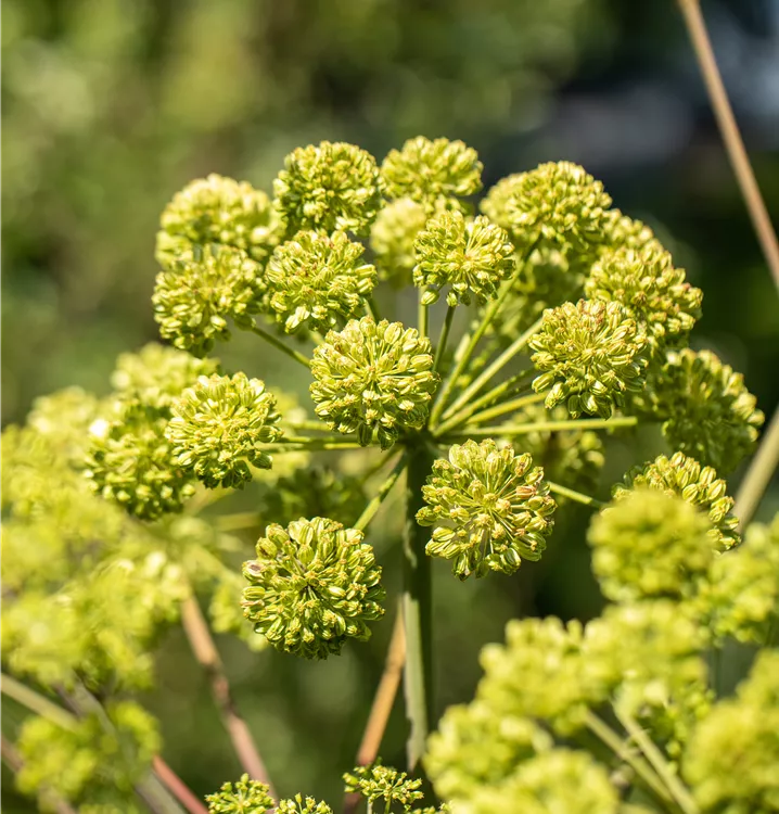 stammt aus dem nördlichen Europa und fand im 14. Jahrhundert Einzug in deutsche Klostergärten. Ihr botanischer Name erinnert an alte Überlieferungen, wonach Engel den Menschen diese Pflanze und ihre Heilwirkungen offenbart haben (angelus = Engel). Heute wird ihre fleischige Pfahlwurzel immer noch verwendet. Zur Nervenstärkung in der Medizin oder für die Herstellung von Likören und Schnäpsen. Im Garten kultiviert man sie eher als Würzpflanze. Ihre jungen Blätter und Blattstiele bereichern Gemüse, Salate, Obstdesserts, Fisch sowie Tees. Lässt man die Blätter bei herb-säuerlichen Früchten mitkochen, braucht man weniger Zucker. Vor der Blüte geerntete Stängel haben ein apfelartiges Aroma. Daran kann man ihn übrigens auch vom ähnlich aussehenden, aber giftigen Schierling unterscheiden. Vorsicht! Verwechslungsgefahr besteht auch mit der giftigen Rebendolde (Oenanthe crocata)!
