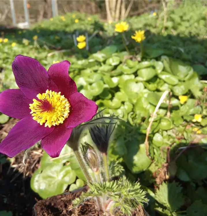 Seidig behaarte Schönheit für verschiedenste Gartensituationen: Die Rote Gewöhnliche Kuhschelle gedeiht besonders gut im sonnigen Steingarten. Aber auch im Staudenbeet, wo man ihre farbenprächtigen, rotvioletten Blüten z.B. mit Phlox subulata Maischnee (Teppich-Phlox) kombinieren kann. Oder bei lichten Gehölzen. Besonders in größeren Gruppen gepflanzt, ist diese altbekannte und bewährte Gartenstaude ein Blickfang. Ihr fein gefiedertes Laub wächst schön buschig und ist flaumig behaart. Ebenso wie die kugeligen Blütenknospen, aus denen sich schon früh im Jahr nickende, glockenförmige Blüten entwickeln. Sie sitzen endständig und jeweils einzeln auf einem aufrechten, unverzweigten Stängel, der ebenfalls silbrig behaart ist. Aus den leuchtenden Blüten entwickeln sich zottelige Fruchtstände, die man ruhig im Beet stehen lassen kann. Fühlt sich die Rote Gewöhnlichen Kuhschelle an ihrem Platz wohl, ist sie sehr langlebig und robust. Die Pflanze ist in allen Teilen giftig. Der Pflanzensaft kann außerdem die Haut reizen. Daher stets mit Handschuhen arbeiten. Gute Bienenweide.