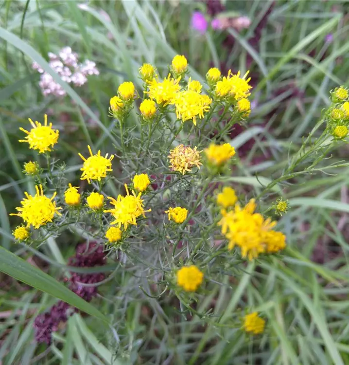 Asternblüten mal ganz anders: Die hübschen, goldgelben Blüten der heimischen Goldhaar-Aster haben keine Zungenblüten. Ihre kugeligen Blütenköpfchen duften leicht nach Honig und sind wichtige Nahrungsquelle für Bienen, Schmetterlinge und Insekten. Sie sitzen am Ende unverzweigter, drahtiger Stängel in einer dichten Doldentraube. Wenngleich der Blütenflor dieser Art nicht so üppig ist wie bei anderen Astern, sollte man dieser tollen heimischen Wildstaude einen Platz im Garten reservieren. Das Laub der aufrecht wachsenden Goldhaar-Aster ist graugrün und so fein, das es fast grasartig wirkt. Auch schon vor der Blüte ist es ein wirkungsvolles Gestaltungselement in Wildstaudenpflanzungen und Steppenheidegärten, in Verbindung mit Gräsern (z.B. Briza media und Melica ciliata) und Sonnenkindern wie Campanula rotundifolia, Verbascum phoeniceum, Teucrium chamaedrys und Helianthemum nummularium. Auch für die Begrünung von trockenen Hängen und Böschungen, ja sogar von Dächern, ist diese anspruchslose, grazile Aster geeignet. Gute Schnittblume.
