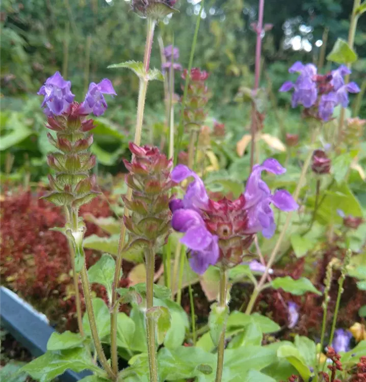 Zuverlässiger Bodendecker für sonnige Plätze: Die Großblütige Braunelle breitet sich kriechend aus und bildet mit der Zeit schöne, bodendeckende Bestände, die im Staudenbeet zuverlässig Unkraut unterdrücken. Man kann sie mit Dorycnium germanicum ssp. pentaphyllum (Deutscher Backenklee) zu sehr natürlich anmutenden, ganzjährig blühenden Pflanzgemeinschaften kombinieren. Auch unter lichten Gehölzen wächst die Großblütige Braunelle sehr gut. Zur Blütezeit schmückt sich die robuste Wildstaude mit blauvioletten, eiförmigen Blütenständen, die sich über das dunkle, eiförmig-lanzettliche Laub erheben und von kurzen, kaum verzweigten Stängeln getragen werden. Ihre Laubblätter wachsen anfangs rosettig und können, ebenso wie die Blüten, roh zu Salaten gegeben oder gekocht in Gemüsen und Suppen zusammen mit anderen Wildkräutern verwendet werden. Die Großblütige Braunelle ist eine beliebte Futterpflanze bei vielerlei Wildbienenarten und Schmetterlingen. Kann als blutstillendes Wundpflaster hergenommen werden.