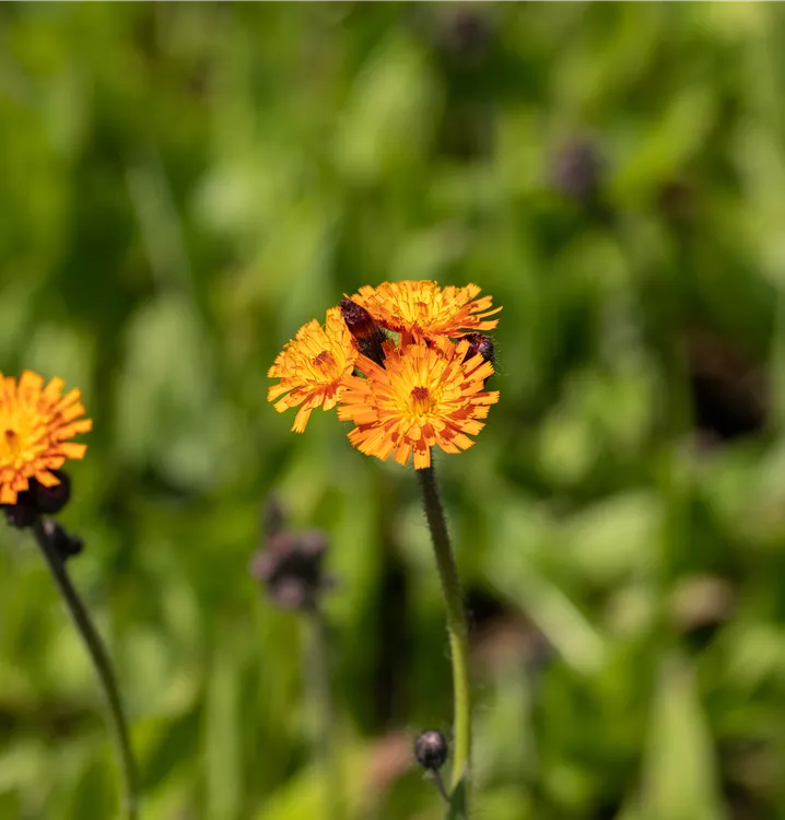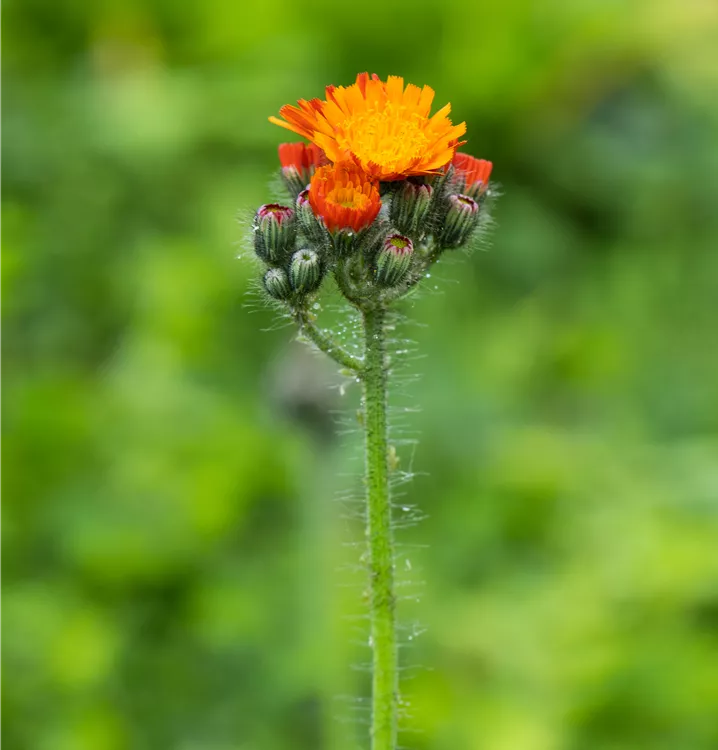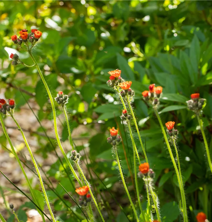 Bodendecker, der auch gerne mal im Garten vagabundiert: Lästig wird das hübsche Orangerote Habichtskraut aber nur selten. Es macht ober- und unterirdische Ausläufer, mit denen es sich zügig verbreitet. Um eine zusätzliche Selbstaussaat zu vermeiden, kann man die Blüten vor dem Ausreifen abzupfen. Am Naturstandort wächst das Orangerote Habichtskraut gerne auf frischem bis feuchtem Boden. Es kommt aber auch mit sehr trockenen Standorten zurecht und passt sich nahezu jeder Gartensituation an. Die orangeroten Blütenkörbchen sind klein und sitzen zu mehreren in einem Knäuel am Ende eines blattlosen Stängels. Am Grund der robusten Staude wachsen spatelförmige bis lanzettliche Blätter in einer feinbehaarten Rosette. Das Orangerote Habichtskraut bildet mit der Zeit dichte Polster und eignet sich gut als wüchsige Unterpflanzung von Viburnum opulus (Gewöhnlicher Schneeball) und Frangula alnus (Gewöhnlicher Faulbaum).